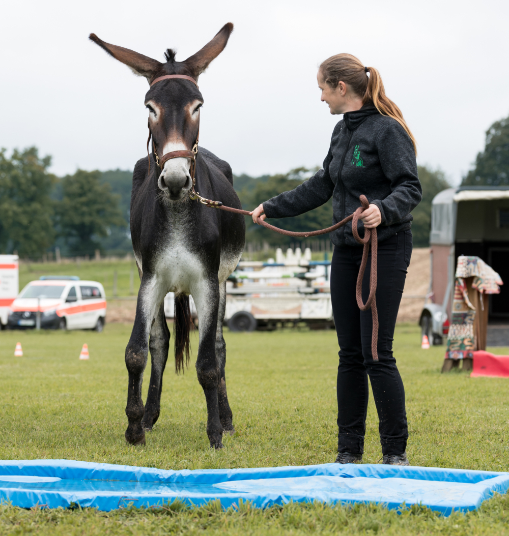 Beim Hindernisparcours zeigen die Halter/-innen, dass sie ihre Tiere schon mit den Hindernissen und Herausforderungen des Alltags vertraut gemacht haben. So müssen die Tiere in einen Hänger einsteigen, Slalom gehen, sich rückwärts richten lassen, durch einen Autoreifen steigen, zum Hufekratzen stillstehen, durch Flatterbänder oder einen engen Tunnel gehen. Dabei kommt es weniger auf die Zeit an als darauf, dass Mensch und Tier die Übungen sauber und gelassen absolvieren. Besonders beeindruckend ist es, wenn die Esel an der Hand von Kindern und Jugendlichen oft so viel vertrauensvoller durch die Hindernisse gehen als mit den Erwachsenen.