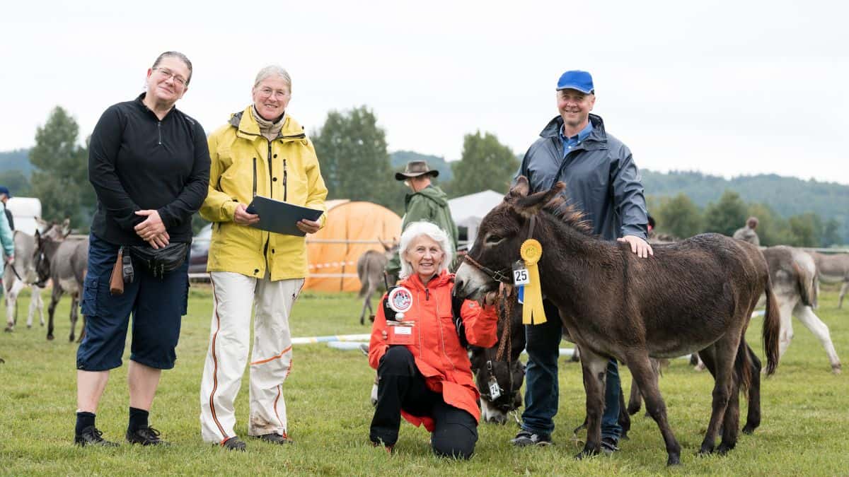 Foto: v. l. n. r. Richterinnen/Richter: Melanie Striebinger, Dr. Susanne von Münchhausen (Zuchtleitung beim DZE e. V.), Maren Hessing, Sören Meyer, Jasmin Redeker und ein Eselbesitzer mit seinem Esel bei der Enterieurbewertung